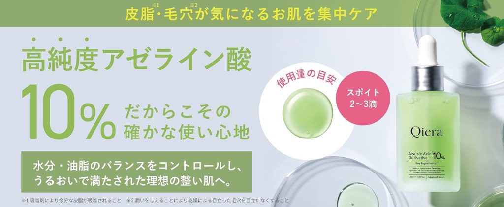 アゼライン酸は成分特有の「乾燥感」や「刺激」が出やすい場合もありますが、Qieraの生アゼライン酸は「モチもち」「しっとり」という保湿力の高さが評価されています。