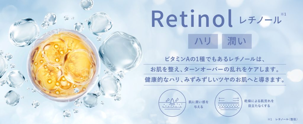 純粋レチノール(整肌成分)を0.1%配合。乾燥による「ごわつき」が気になる肌も、つるんとした印象に。本格的なエイジングケア※をサポートします。