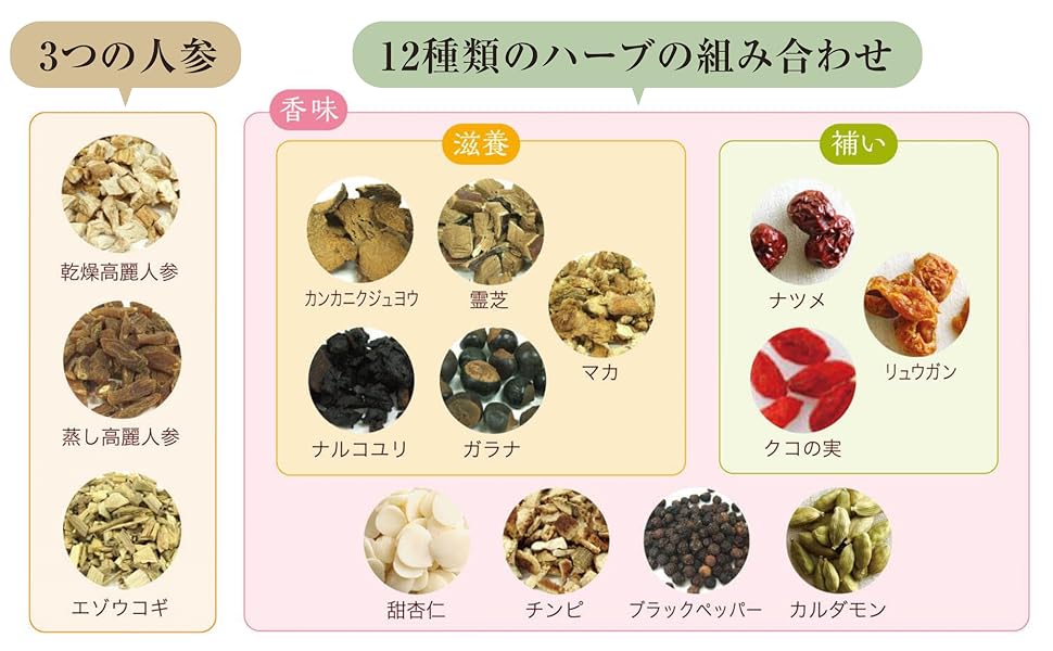 カンカニクジュヨウ、霊芝、マカ、ガラナ、ナルコユリ、ナツメ、リュウガン、クコの実、甜杏仁、チンピ、ブラックペッパー、カルダモン